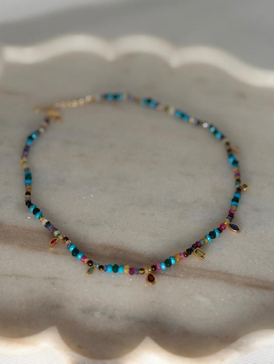 18k gold on beaded necklace made with all natural and precious stones -