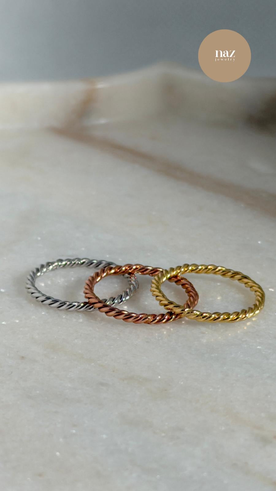 Triplets 18k gold stackable twisty rings in rose, white, and yellow gold